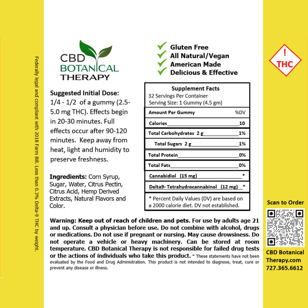 - Contains 12mg of THC and 15 mg of CBD per gummy